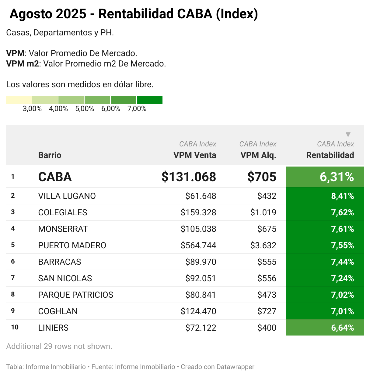 - Barrios como Colegiales (7,62 %), Monserrat (7,61 %), Barracas (7,44 %) y San Nicolás (7,24 %) muestran retornos sólidos, aunque con valores de entrada más elevados.